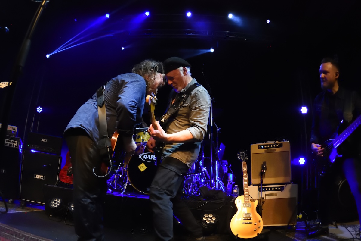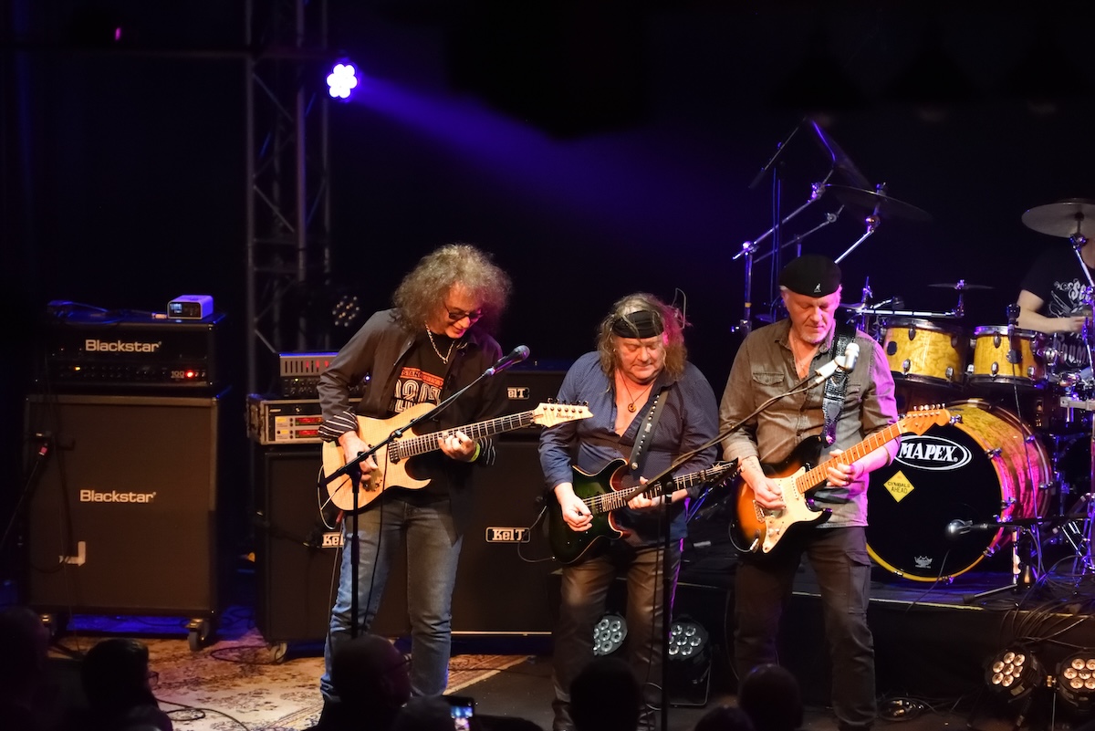 Pat O’May : Alors, de mon côté, je garde vraiment mon son. J’ai ma guitare fétiche Vola que je ne lâche pas pour le moment, même si j’entame une collaboration avec Marceau Guitars. Pour les amplis, ce sont des KelT, que j’adore vraiment. Un peu comme Fred, je n’ai pas cherché à changer quoi que ce soit : pourquoi changer quand ça fonctionne ? La seule vraie différence, c’est le niveau de saturation. J’en mets un peu moins que quand je joue seul, parce qu’à trois guitares, il n’y a pas besoin de remplir autant, notamment sur les rythmiques. Côté effets, c’est très simple. Une distorsion que j’active quand je pars en solo, un delay… et c’est à peu près tout. Le delay, c’est un TC Electronic G-Major 2. Il me permet d’attaquer mes deux amplis en même temps. En fait, j’en ai même deux, un par ampli, chacun avec son délai autonome, en insert. Mais, globalement, il n’y a pas énormément de choses. Je reste sur quelque chose de simple, efficace, et fidèle à mon son. Et puis par rapport à la Gibson Les Paul. Donc, quand on fait ce fameux morceau Gary’s Gone, de très joli morceau hommage à Gary Moore. Comme Fred a sa Gibson, moi j’ai pris la chemise de Gary Moore (rires gras).