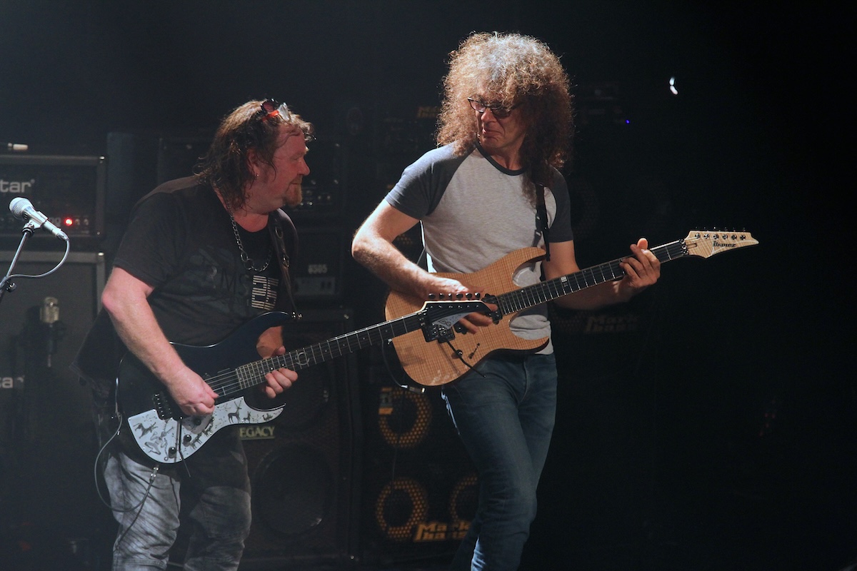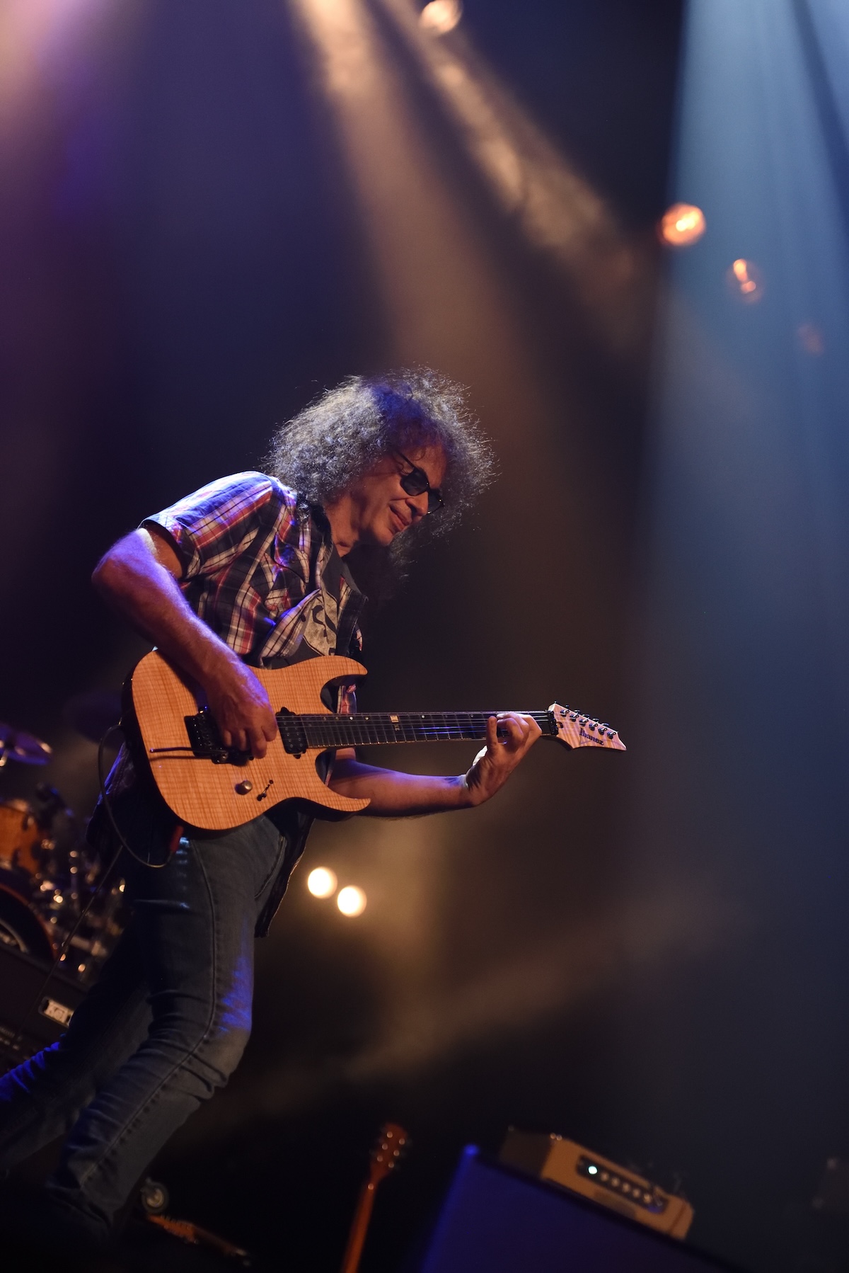 Patrick Rondat : De mon côté, c’est un peu particulier. Pour des raisons de logistique, je n’utilise pas mon propre backline. Je joue sur des amplis Blackstar qui appartiennent à Pat, des Series One. Normalement, quand je suis en tournée, j’essaie de jouer sur deux amplis en stéréo avec un système wet/dry, mais là, c’était un peu trop compliqué à mettre en place. On a donc fait au plus pratique. Je suis sur une tête Series One, avec un delay. J’utilise aussi une réverb White Bird, mais très rarement, juste sur certains passages, en insert. À part ça, il y a un accordeur… Et c’est tout. Côté guitares, j’ai longtemps joué toutes les dates de Guitar Night Project avec une Ibanez Custom Shop USA, corps en acajou, table érable, frettes inox, équipée de DiMarzio PAF 36. Récemment, je suis passé sur une nouvelle Ibanez RG 5320, mais l’essentiel du projet s’est fait avec cette Custom Shop.